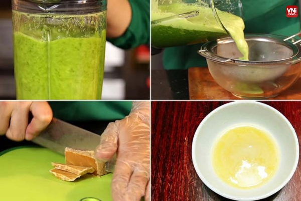 Start by washing about 100 grams of pandan leaves, then cut them into small pieces. Blend the leaves with 200 milliliters of water until smooth. Strain the mixture through a fine cloth or sieve to extract the deep green pandan juice — that’s where all the aroma lives.