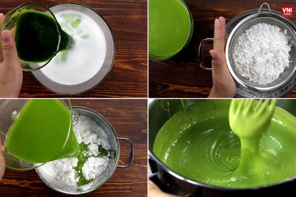 In another bowl, sift together 180 grams of rice flour and 120 grams of tapioca starch. Gradually pour in the warm pandan–coconut mixture, whisking slowly until the batter turns smooth and glossy.